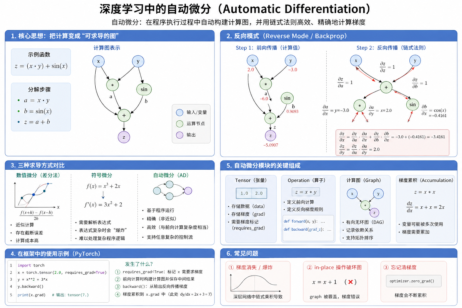 深度学习中的自动微分(Automatic Differentiation, 简称 AutoDiff 或 AD)是现代深度学习框架(如 PyTorch、TensorFlow)的“引擎”。神经网络的训练依赖于梯度下降算法,而要更新网络中成千上万甚至上百亿个参数,我们需要知道损失函数对每个参数的导数(梯度)。自动微分模块的作用就是自动、高效、精确地计算这些复杂的导数。